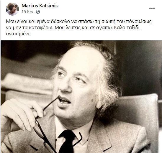 Μετά το συγκινητικό αντίο της Έλλης Στάη στον πατέρα του παιδιού της και ο Μάρκος Κατσίμης συγκινεί με το δημόσιο τελευταίο αντίο στον μπαμπά του:  “Μου είναι και εμένα δύσκολο να σπάσω τη σιωπή του πόνου. Ισως να μην τα καταφέρω. Μου λείπεις και σε αγαπώ. Καλό ταξίδι αγαπημένε” έγραψε ο Μάρκος Κατσίμης.