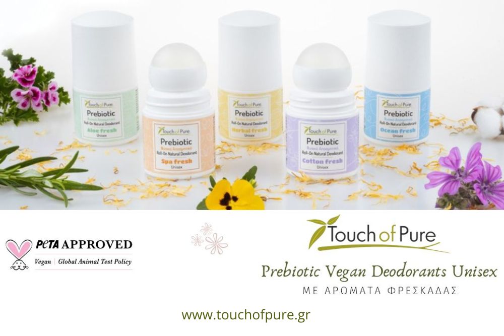 Η καινοτόμα σύσταση των αποσμητικών Touch of Pure, με πρεβιοτικά, αποσμητικό κρύσταλλο, βιολογικό λάδι αγριελιάς και βιολογικά αιθέρια έλαια με αντιμικροβιακές ιδιότητες, με εξαιρετικά απαλή υφή, επαναφέρει την ισορροπία στο μικροβίωμα του δέρματος, καταπολεμώντας τα βακτήρια που προκαλούν τη δυσοσμία του ιδρώτα.