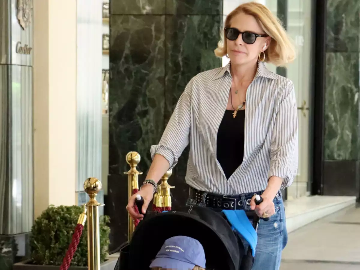 Η ευτυχισμένη μητέρα, με casual look, απαθανατίστηκε να απολαμβάνει την βόλτα της, έχοντας τον μικρότερο γιο της στο καροτσάκι.