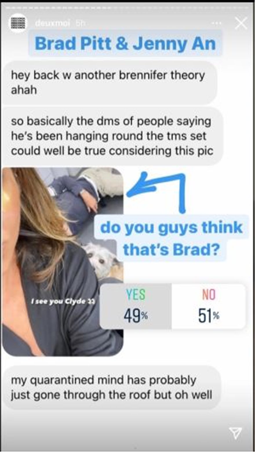 Το κεφάλι της καλύπτει την ταυτότητά του ξαπλωμένου άνδρα. Ο γνωστός ιστότοπος, Deuxmoi, έγραψε πως σύμφωνα με πηγές ο άνδρας «χωρίς πρόσωπο» είναι ο Μπραντ Πιτ. Μάλιστα, ο ιστότοπος έκανε δημοσκόπηση στο Instagram με το ερώτημα: «Πιστεύετε ότι είναι ο Μπραντ»; Το ερώτημα, όπως θα δείτε παρακάτω, δίχασε το κοινό αφού το 49% απαντά «ναι» και το 51% «όχι».