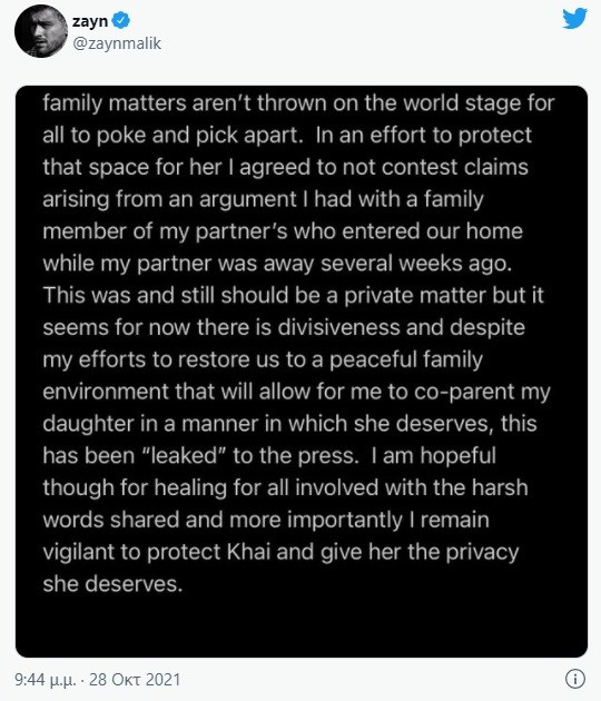 Από την πλευρά του ο Ζέιν Μάλικ αρνείται κατηγορηματικά το γεγονός: «Όπως όλοι γνωρίζετε, είμαι άνθρωπος που εκτιμά την ιδιωτικότητα.