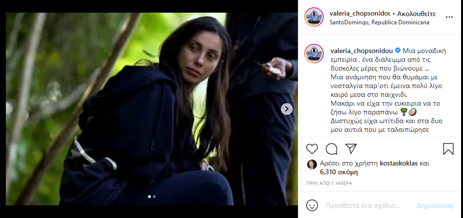 Την πρώτη της δημοσίευση στο Instagram έκανε η σχεδιάστρια Βαλέρια Χοψονίδου. Έχουν ήδη περάσει αρκετές ημέρες από την επιστροφή της από τον Άγιο Δομίνικο.