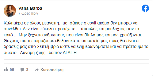 «Καλημέρα σε όλους με αγάπη… Με τσάκισε ο Covid ακόμα δεν μπορώ να συνέλθω. Δεν είναι εύκολο προσέχετε… ύπουλος και μουλωχτός σαν το κακό… Μην ξεχνάτε ανθρώπους που είναι δίπλα μας και μας χρειάζονται. Θα σας πω τι ετοιμάζουμε εθελοντικά το σωματείο μας ποιες θα είναι οι δράσεις μας από Σεπτέμβριο ώστε να ενημερωνόμαστε και να πράττουμε το σωστό… Δύναμη ζωής. Λοιπόν ΑΓΑΠΗ» έγραψε η Βάνα Μπάρμπα.