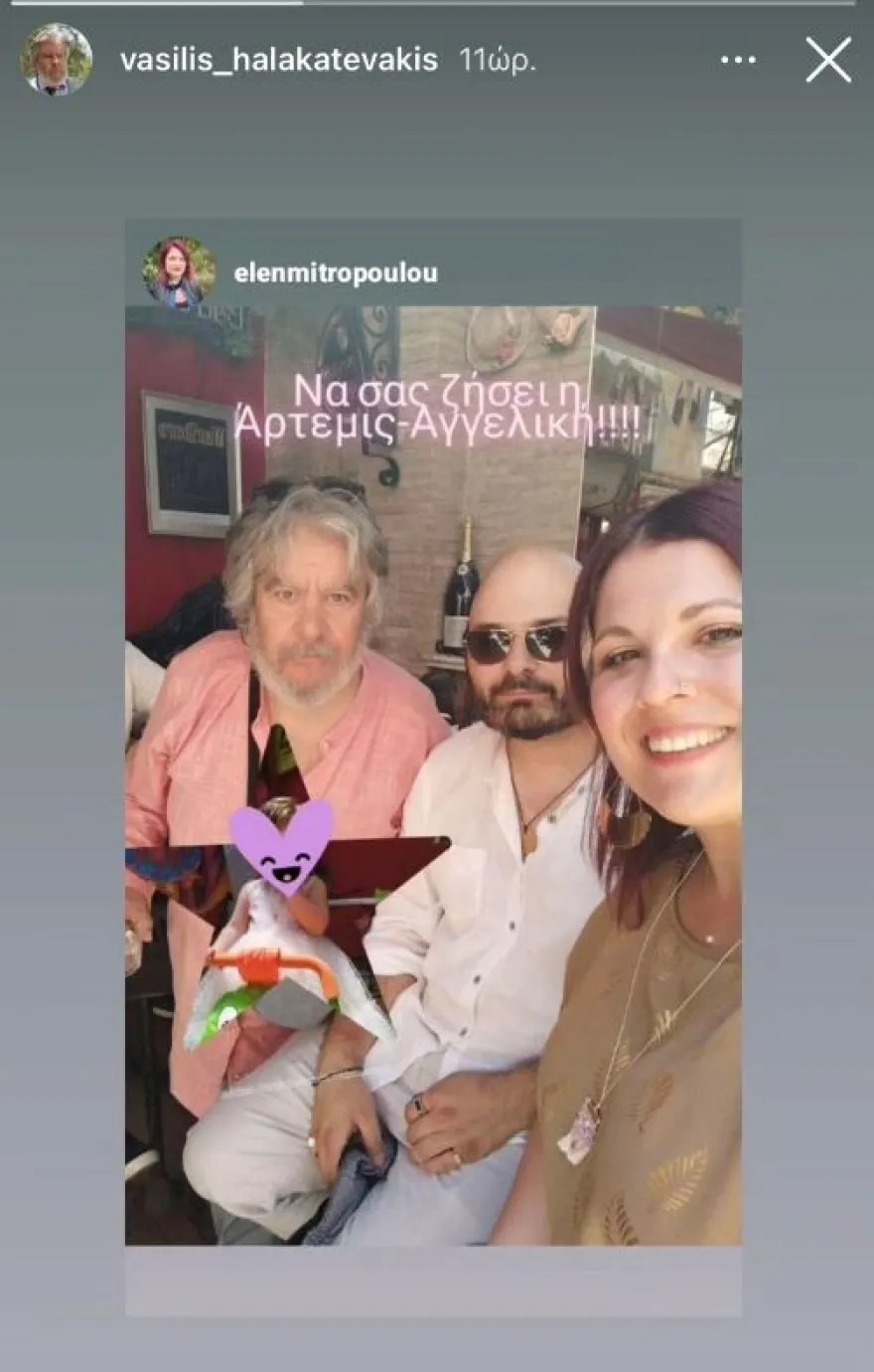 Ο Βασίλης Χαλακατεβάκης αναδημοσίευσε στον προσωπικό του λογαριασμό στο Instagram ένα στιγμιότυπο που ανάρτησε μία από τις καλεσμένες στη βάφτιση. Πάνω σε αυτό, αναφέρει: «Να σας ζήσει η Άρτεμις-Αγγελική».