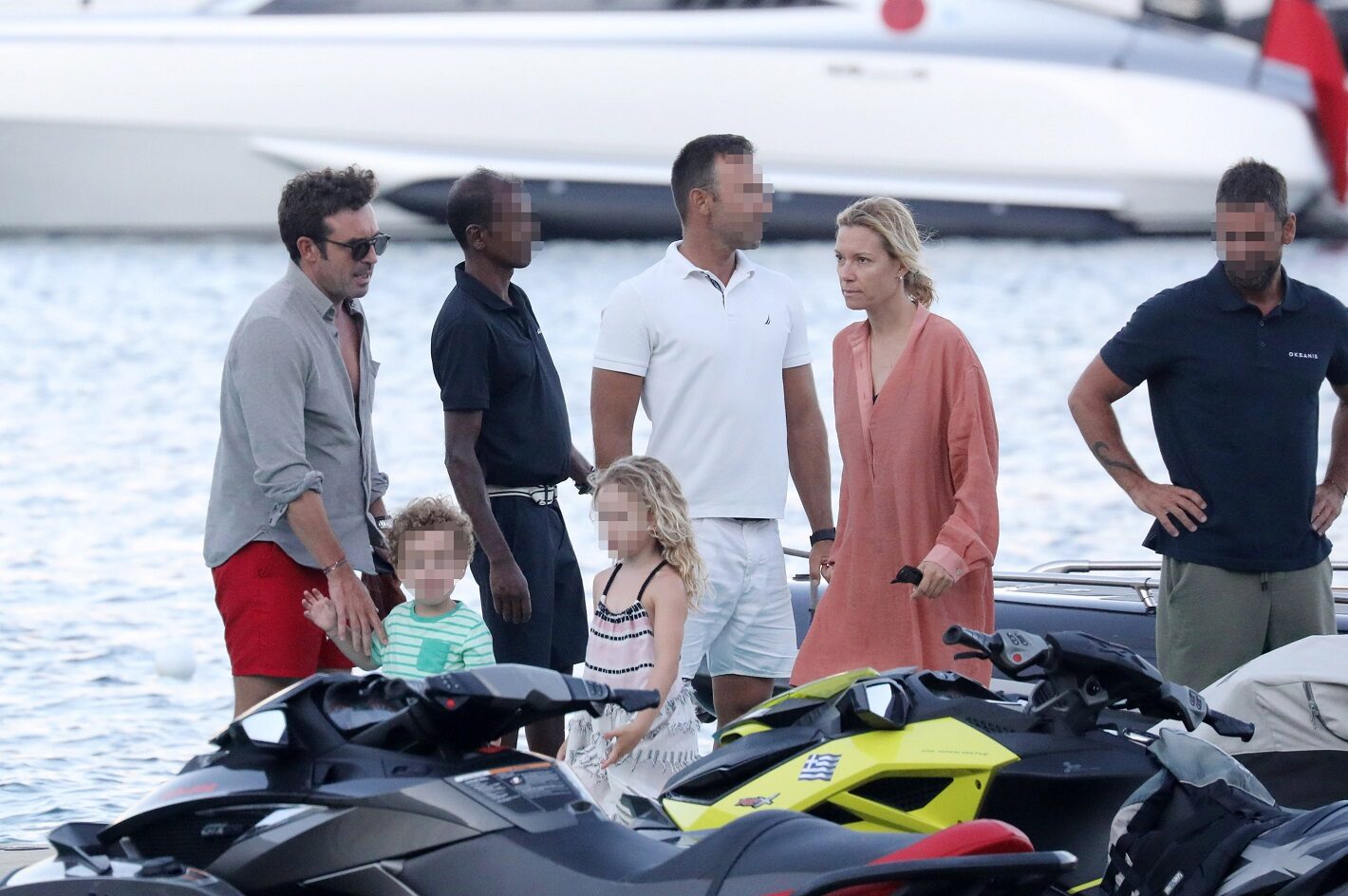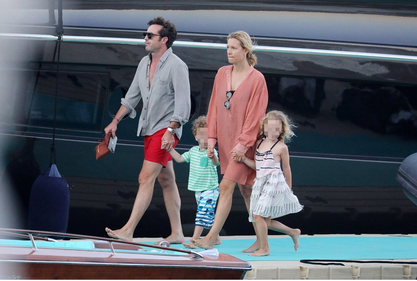 Ο φωτογραφικός φακός τσάκωσε το ζευγάρι μαζί με τα παιδιά τους Μπιάνκα και Κάρολο. λίγο πριν φτάσουν στην παραλία πάνω στο σκάφος τους. Η Βίκυ Καγιά φόρεσε ένα κομμάτι passpartout για μία βόλτα στη θάλασσα με τα παιδιά. Αέρινο, άνετο και βολικό, δεν εμποδίζει καμία κίνηση.