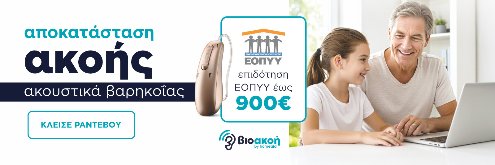 Αποκατάσταση ακοής, με επιδότηση ΕΟΠΥΥ έως 900€. Κλείσε τώρα ραντεβού για μια δωρεάν συνεδρία και δες ποιος τύπος ακουστικού είναι για σένα.