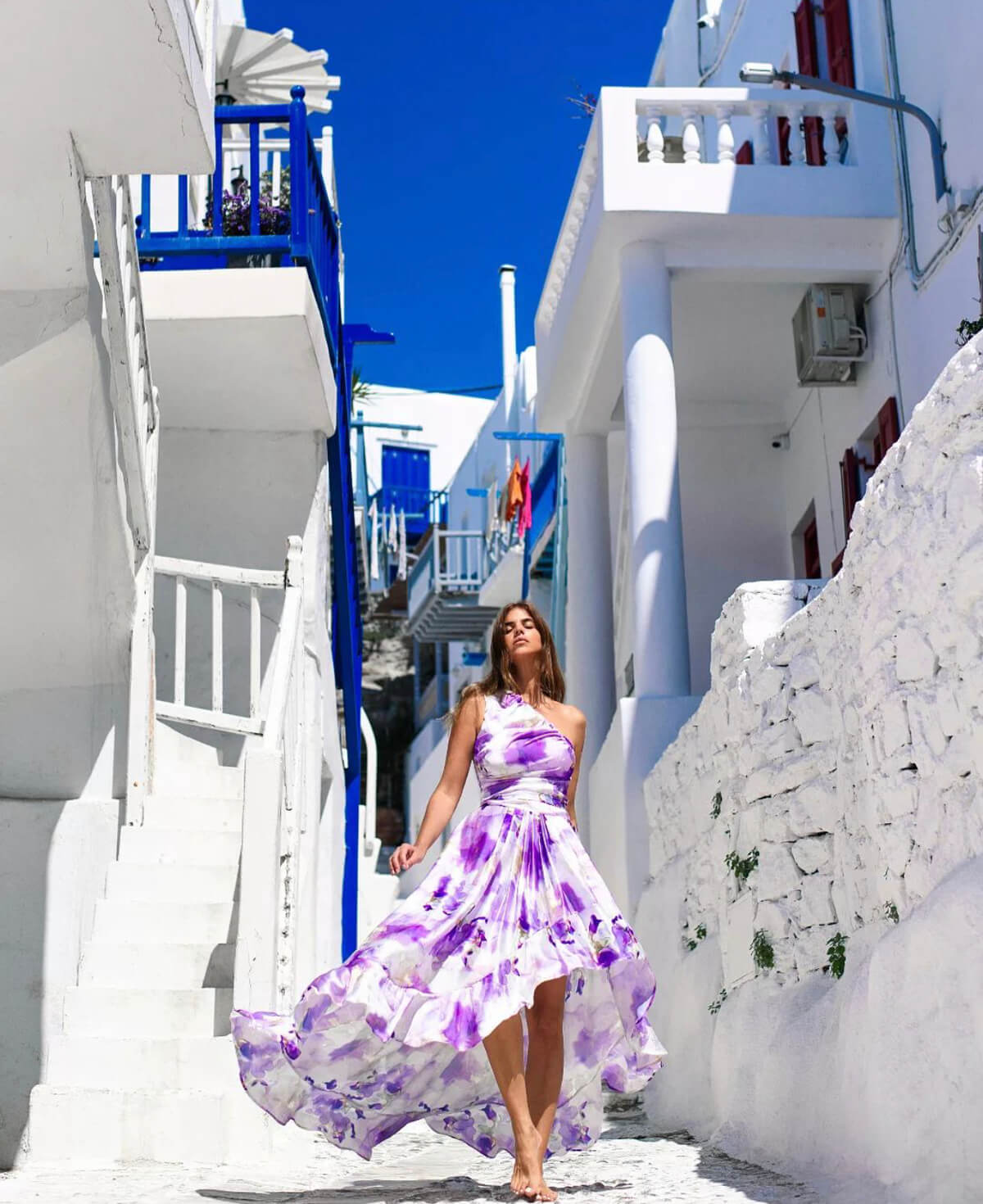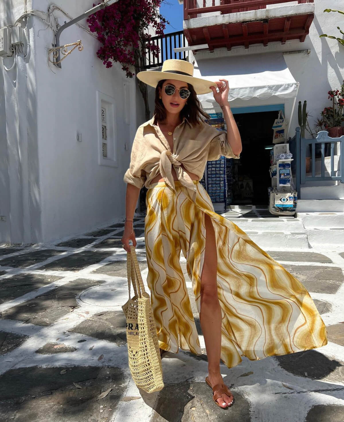 Αέρινα φορέματα, prints, φλάτ παπούτσια κυριαρχούν στα στενά της Μυκόνου και της Σαντορίνης και τα χρώματα αποκτούν πρωταγωνιστικό ρόλο.