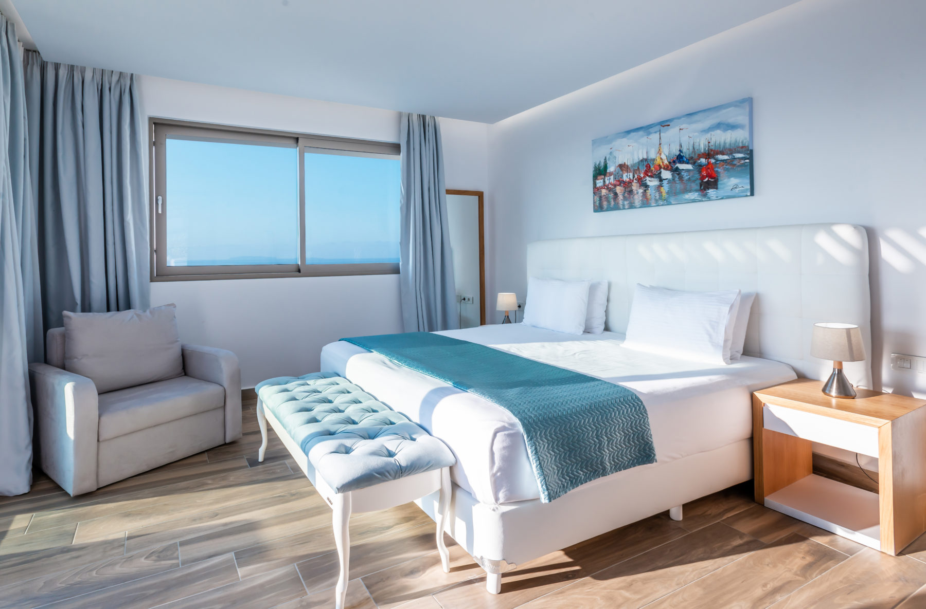 Με ξύλινα έπιπλα, ζεστά φυσικά χρώματα και μοντέρνα διακοσμητικά αντικείμενα, τα δωμάτια και οι σουίτες είναι άνετα και έξυπνα, με αίσθηση χώρου και φωτός, εξοπλισμένα πλήρως με όλες τις ανέσεις και εγκαταστάσεις ενός πολυτελούς ξενοδοχείου 5 αστέρων στην Κω . Τα ψηλά παράθυρα και οι ευάερες λευκές κουρτίνες εξασφαλίζουν τη φωτεινότητα των δωματίων, ενώ οι βεράντες όλων των πολυτελών δωματίων και σουιτών είναι το αληθινό κόσμημα, με εκπληκτική θέα.