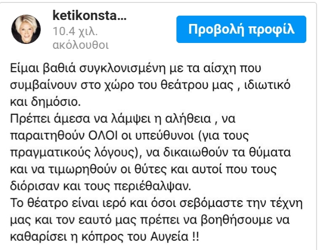 Συγκλονισμένη με τα όσα δυσάρεστα έρχονται διαρκώς στη δημοσιότητα από τον χώρο του θεάτρου δηλώνει η Καίτη Κωνσταντίνου στην τελευταία της ανάρτηση στον προσωπικό της λογαριασμό στο Instagram.