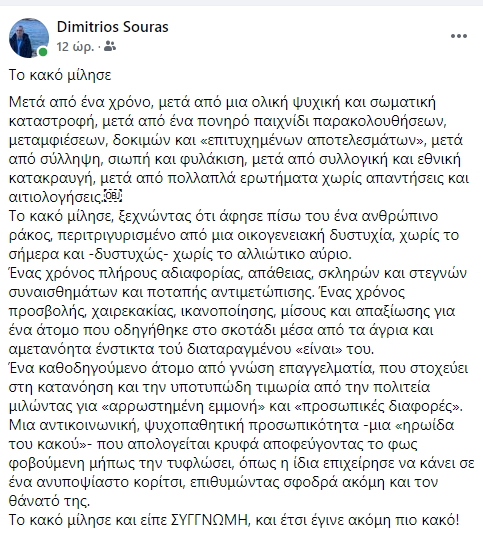 «Το κακό μίλησε. Μετά από έναν χρόνο, μετά την ολική ψυχική και σωματική καταστροφή, μετά το πονηρό παιχνίδι παρακολουθήσεων, μεταμφιέσεων, δοκιμών και “επιτυχημένων αποτελεσμάτων”, μετά τη σύλληψη, σιωπή και φυλάκιση, μετά τη συλλογική και εθνική κατακραυγή, μετά τα πολλαπλά ερωτήματα χωρίς απαντήσεις και αιτιολογήσεις.
