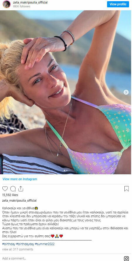 Η Ζέτα Μακρυπούλια έχει σήμερα τα γενέθλιά της και προχώρησε σε ανάρτηση στον προσωπικό της λογαριασμό στο Instagram.