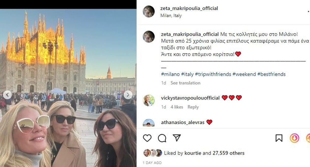 «Με τις κολλητές μου στο Μιλάνο! Μετά από 25 χρόνια φιλίας επιτέλους καταφέραμε να πάμε ένα ταξίδι στο εξωτερικό! Άντε και στο επόμενο κορίτσια», έγραψε.
