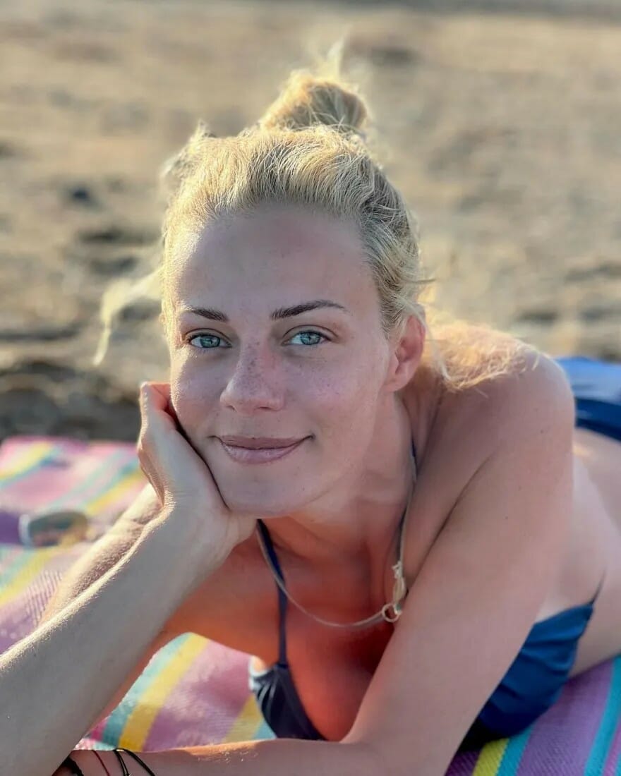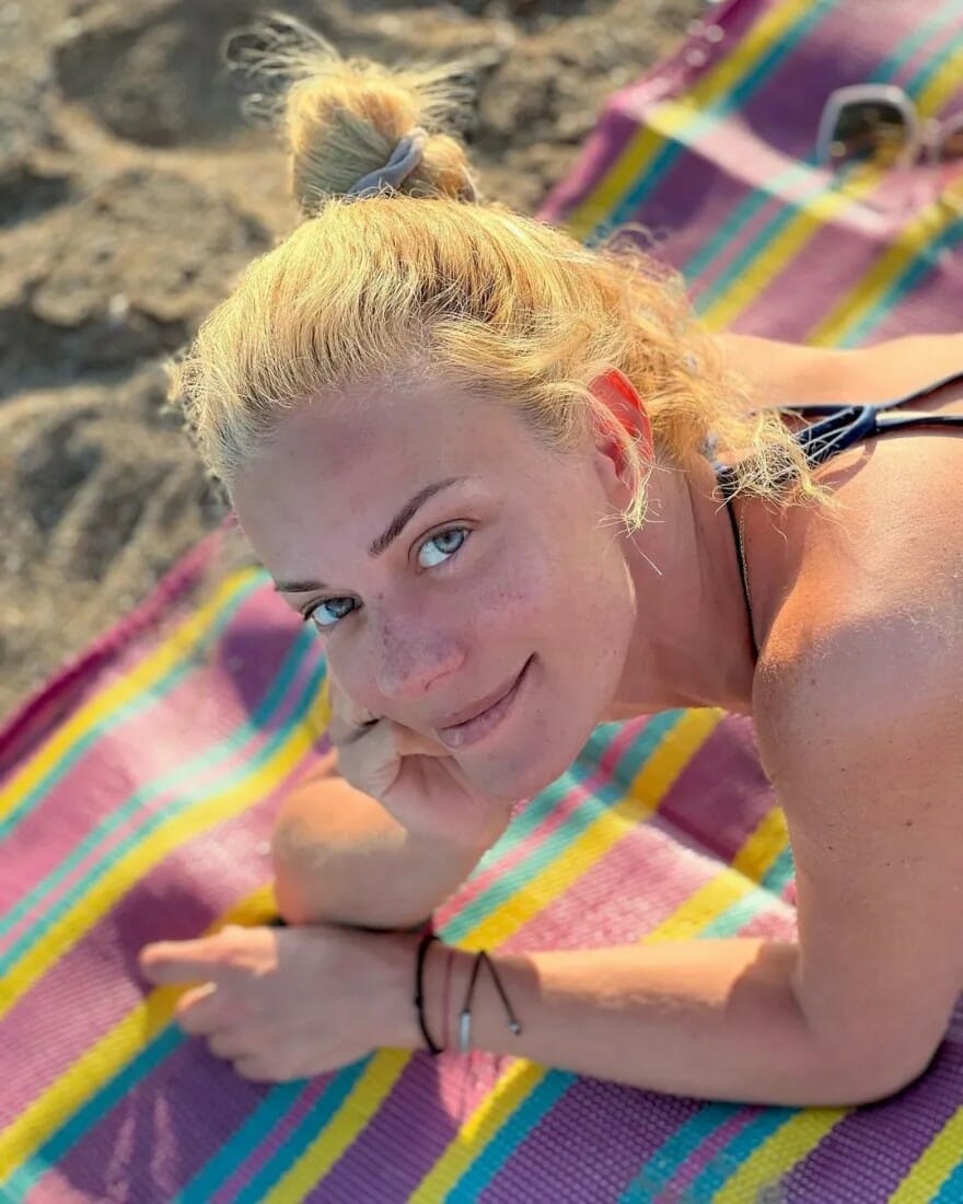 Στα τρία στιγμιότυπα που «ανέβασε» εμφανίζεται χαμογελαστή, χαλαρή και αμακιγιάριστη, ξαπλωμένη σε μια πολύχρωμη ψάθα στη θάλασσα.